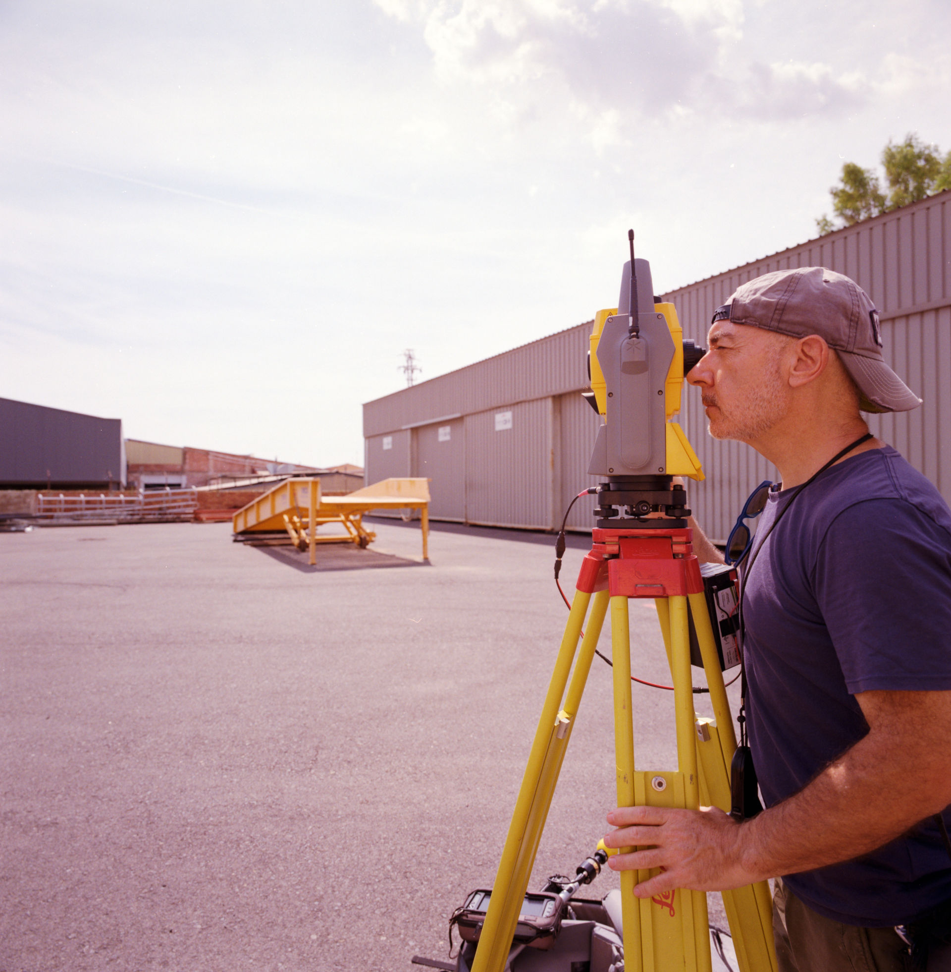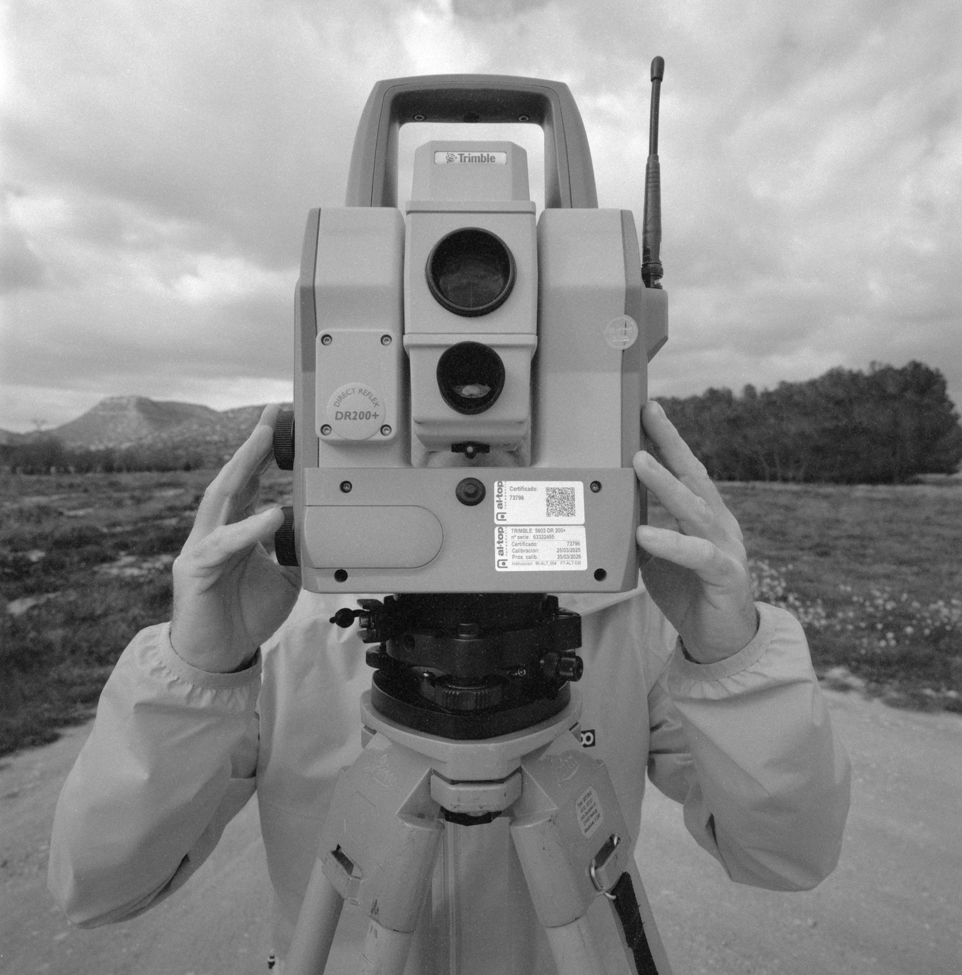 Imagen 1: Frente a frente con la estación total robotizada Trimble 5603 DR200+. Disparado con cámara Hasselblad Super Wide, óptica Carl Zeiss Biogon F4.5 38mm y película Fomapan 400 Action, revelado con Rodinal.